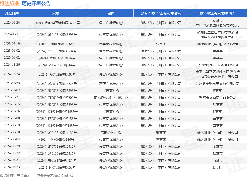 本站消息,根据天眼查APP显示,近日公布了一则维达纸业(中国)有限公司作为被告/被上诉人的开庭公告,详细内容如下: